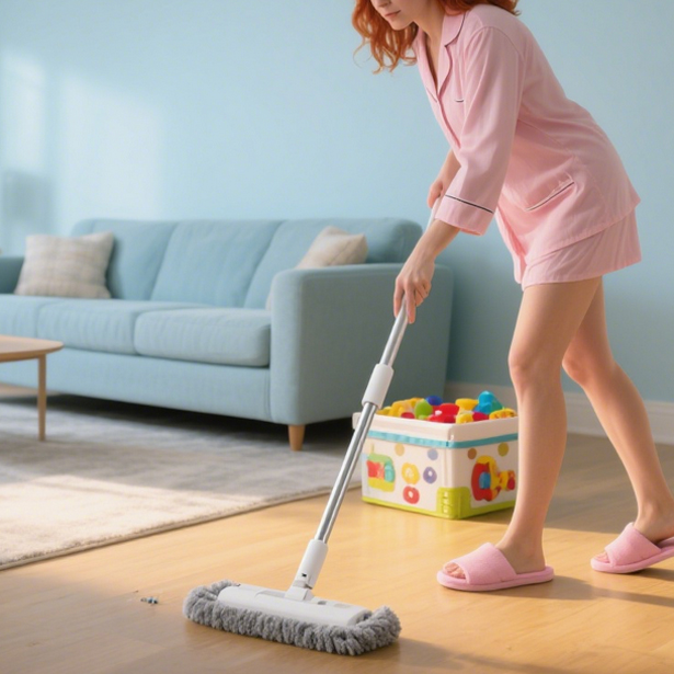 Hands-free wet and dry mop features dual-use cleaning, self-wringing mechanism, 360° swivel head, reusable microfiber pads, and lightweight design for efficient floor care.